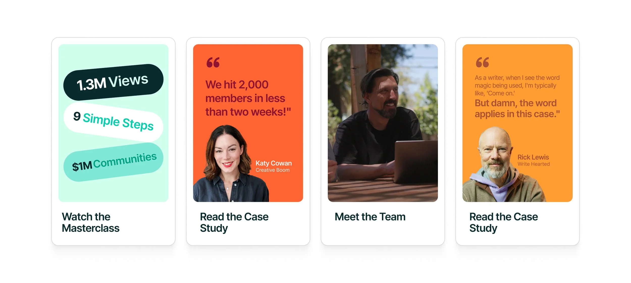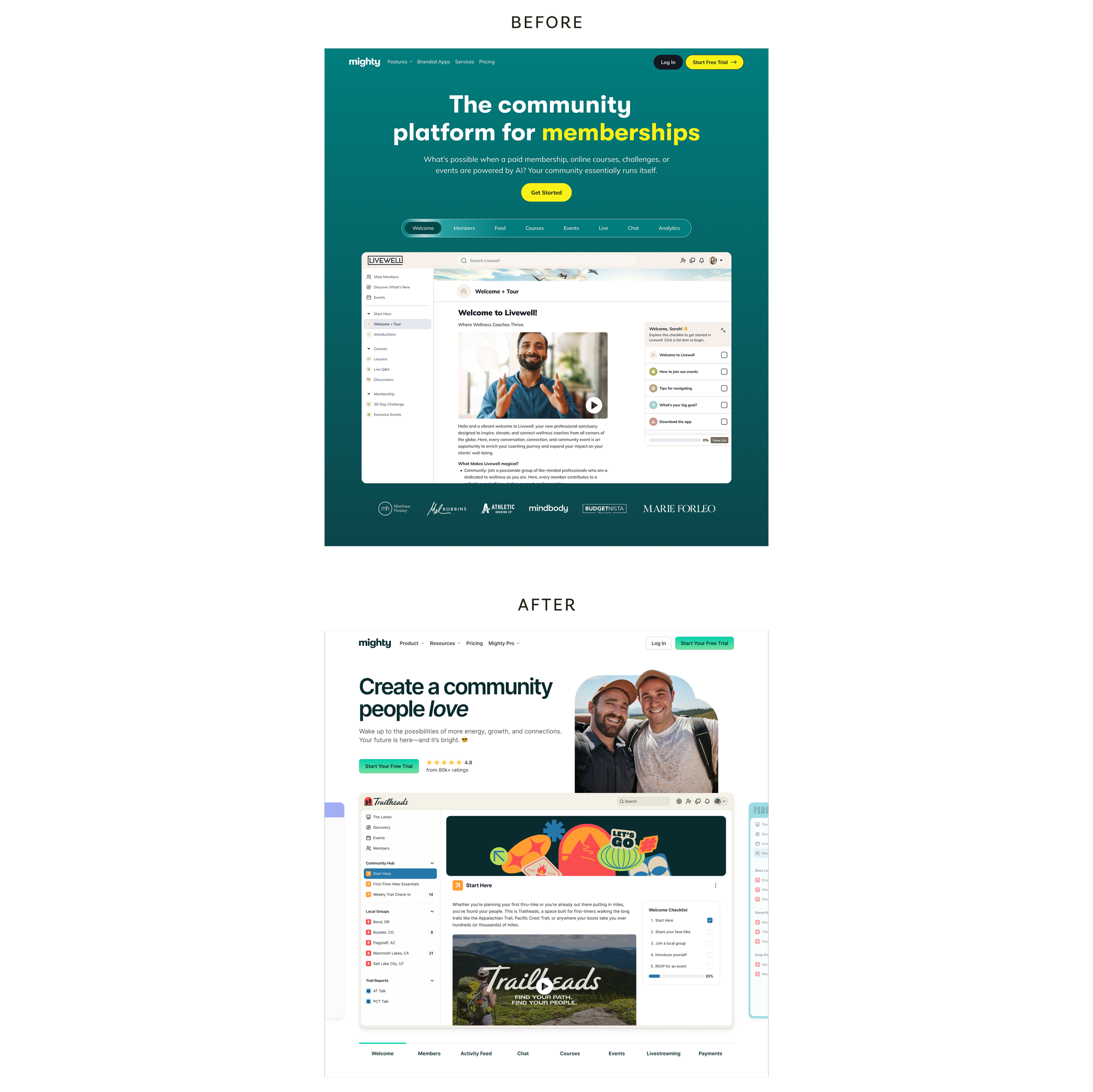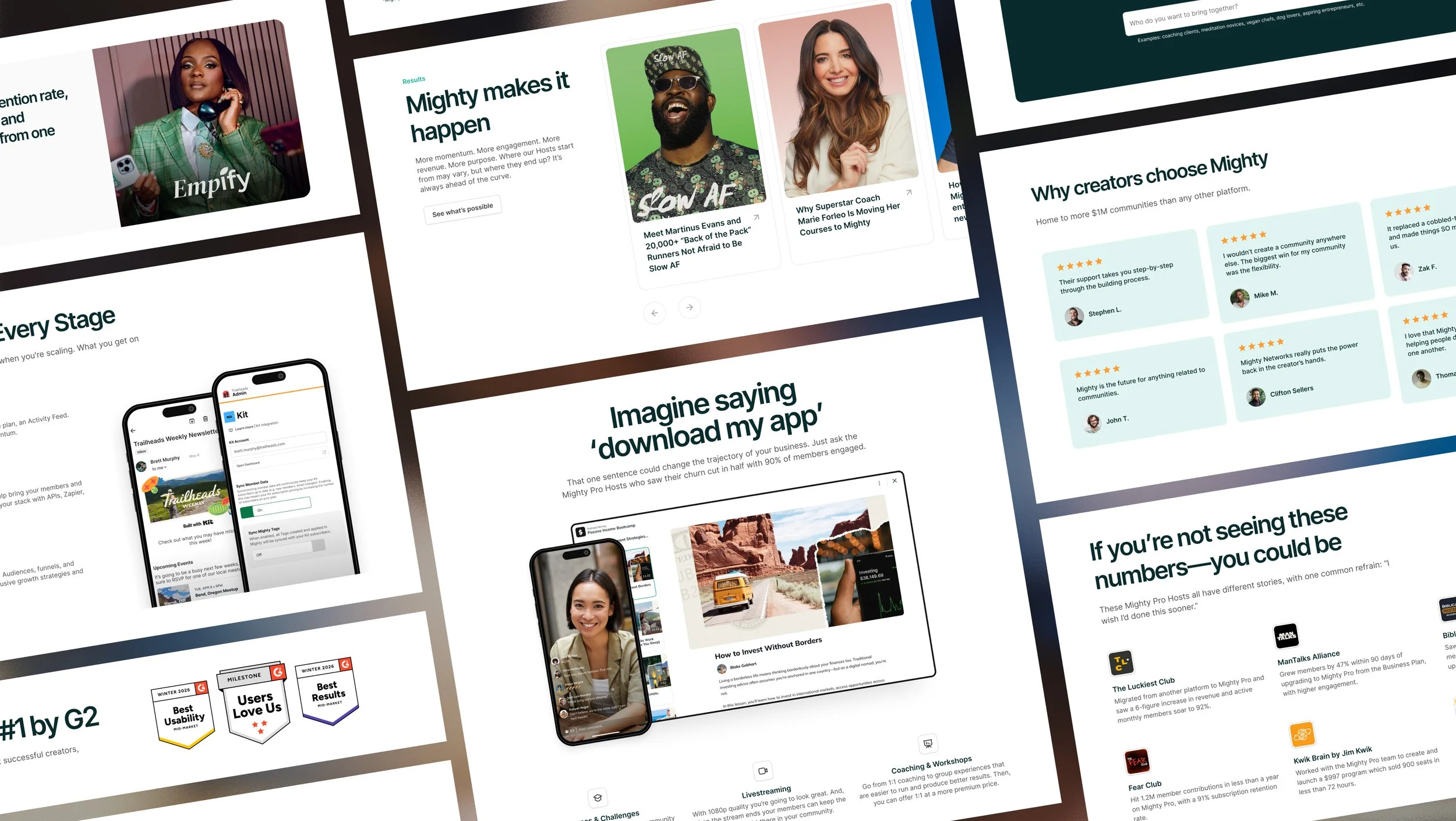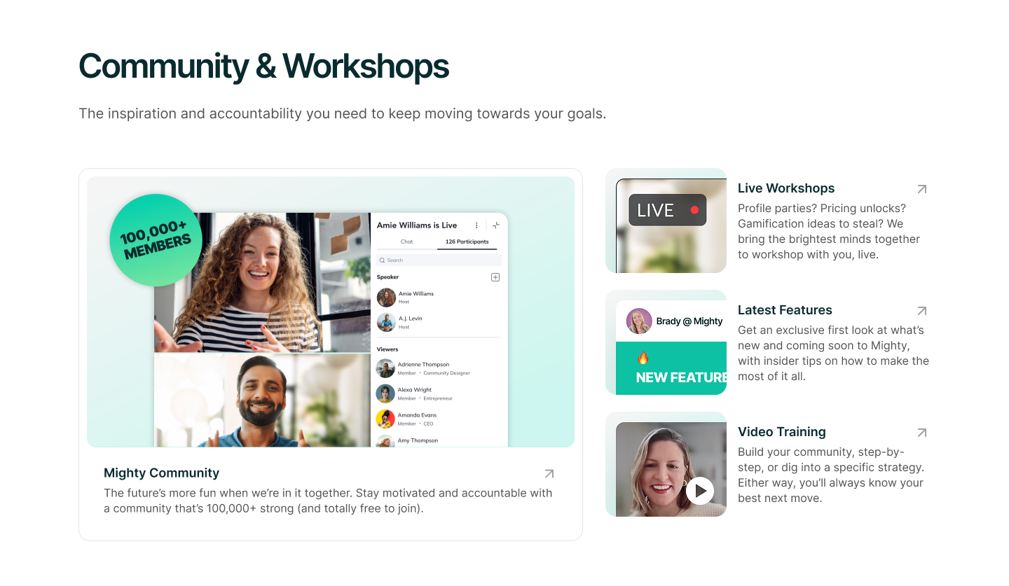 A major piece of the Mighty website is showcasing the actual product. As part of the brand refresh, we developed a series of faux communities in order to illustrate all the different ways the software can be used. This entailed creating graphics to mimic the real, vibrant communities that live on Mighty Networks, including assets for activity feeds, events, courses and more. I also storyboarded specific product screens and partnered with a motion designer to bring them to life in key areas across the website.